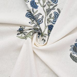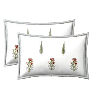 Delicate tree pattern in blue & muted green. If you look closely you will find birds & a deer! This charming pattern bedsheet stands out from traditional designs. A delicate green border outlines the bedsheets & pillows.