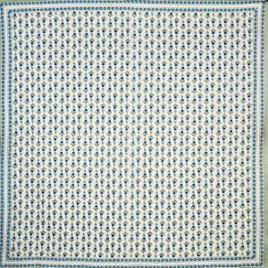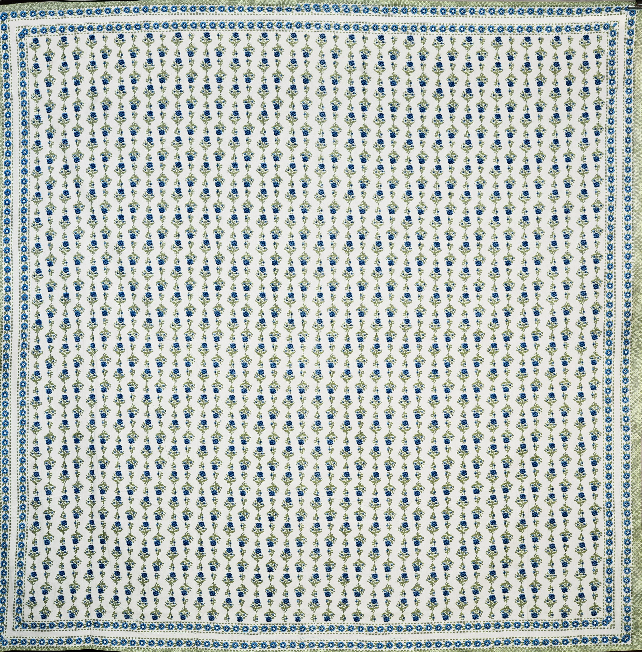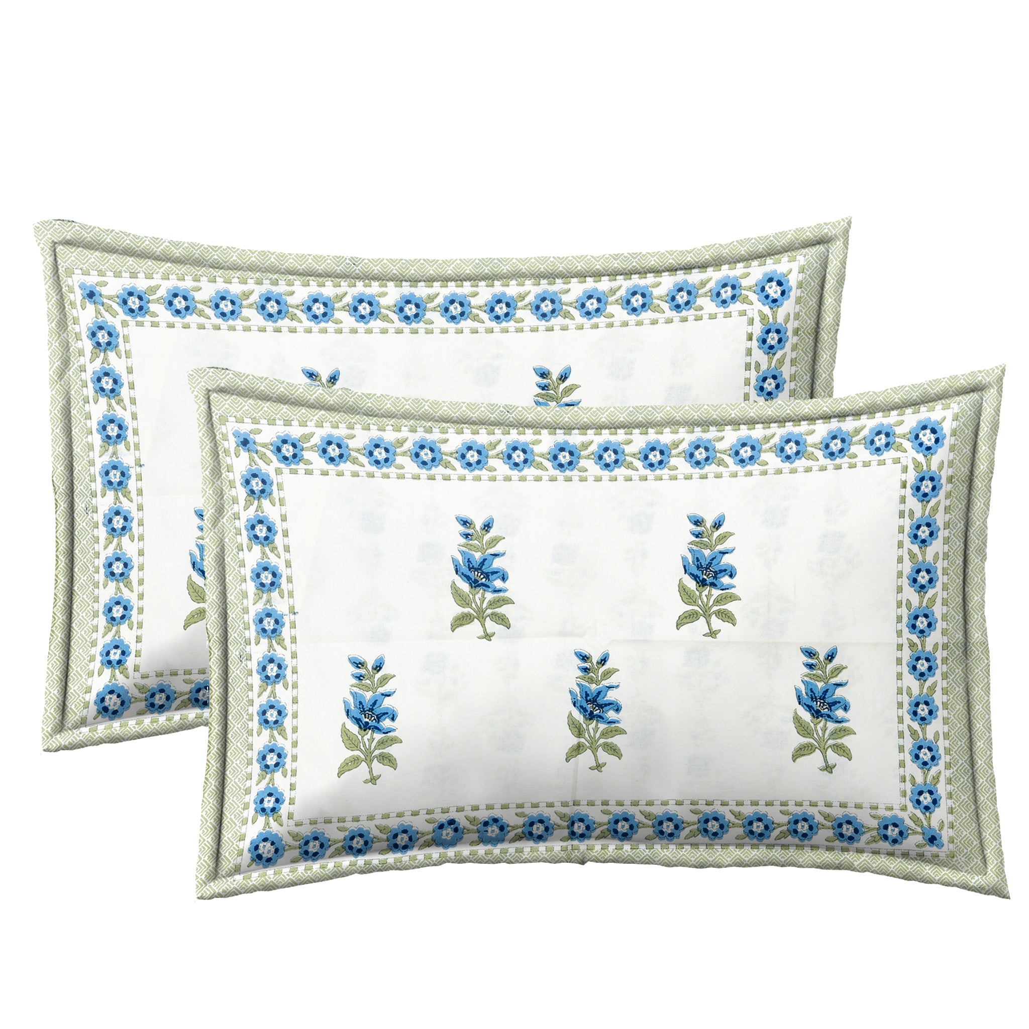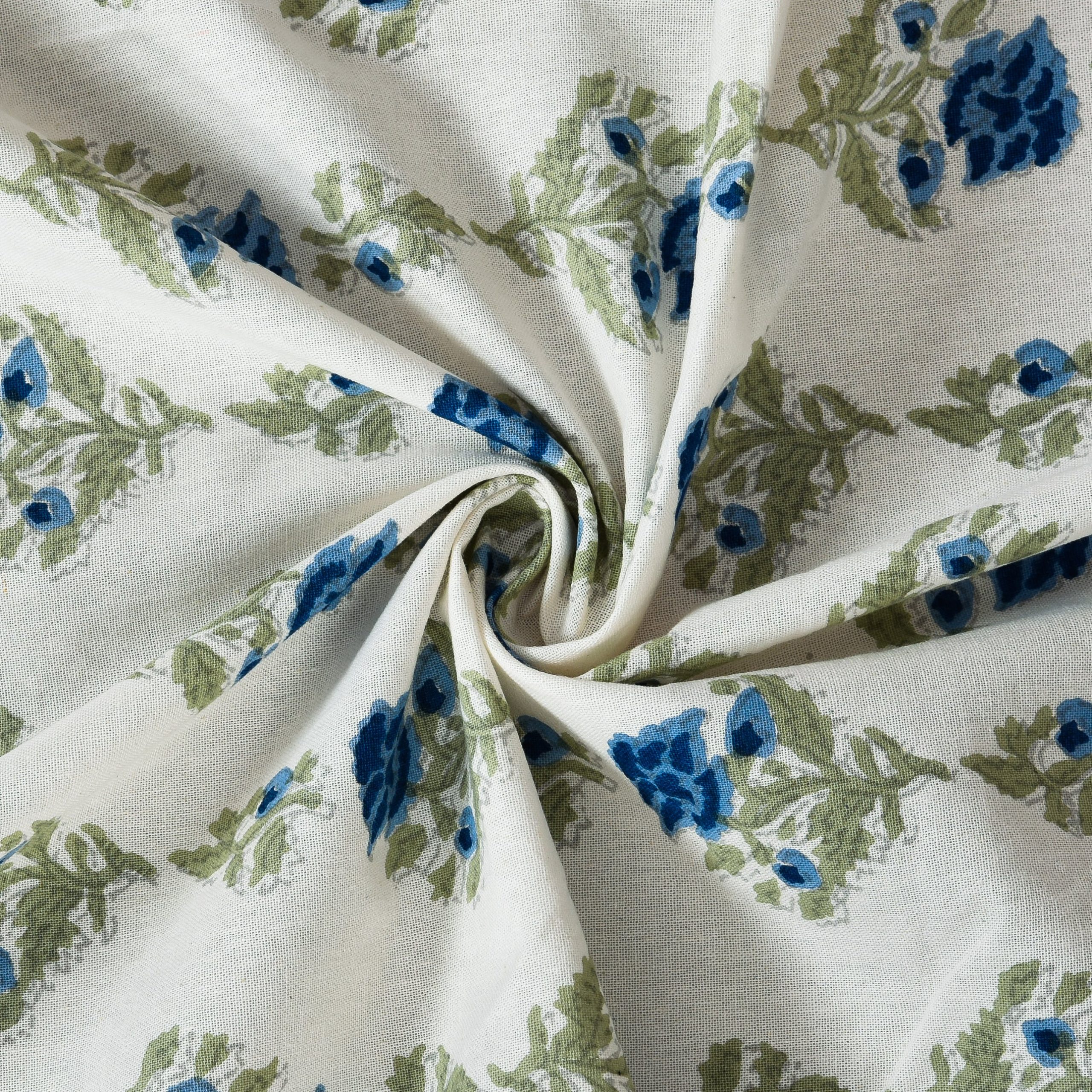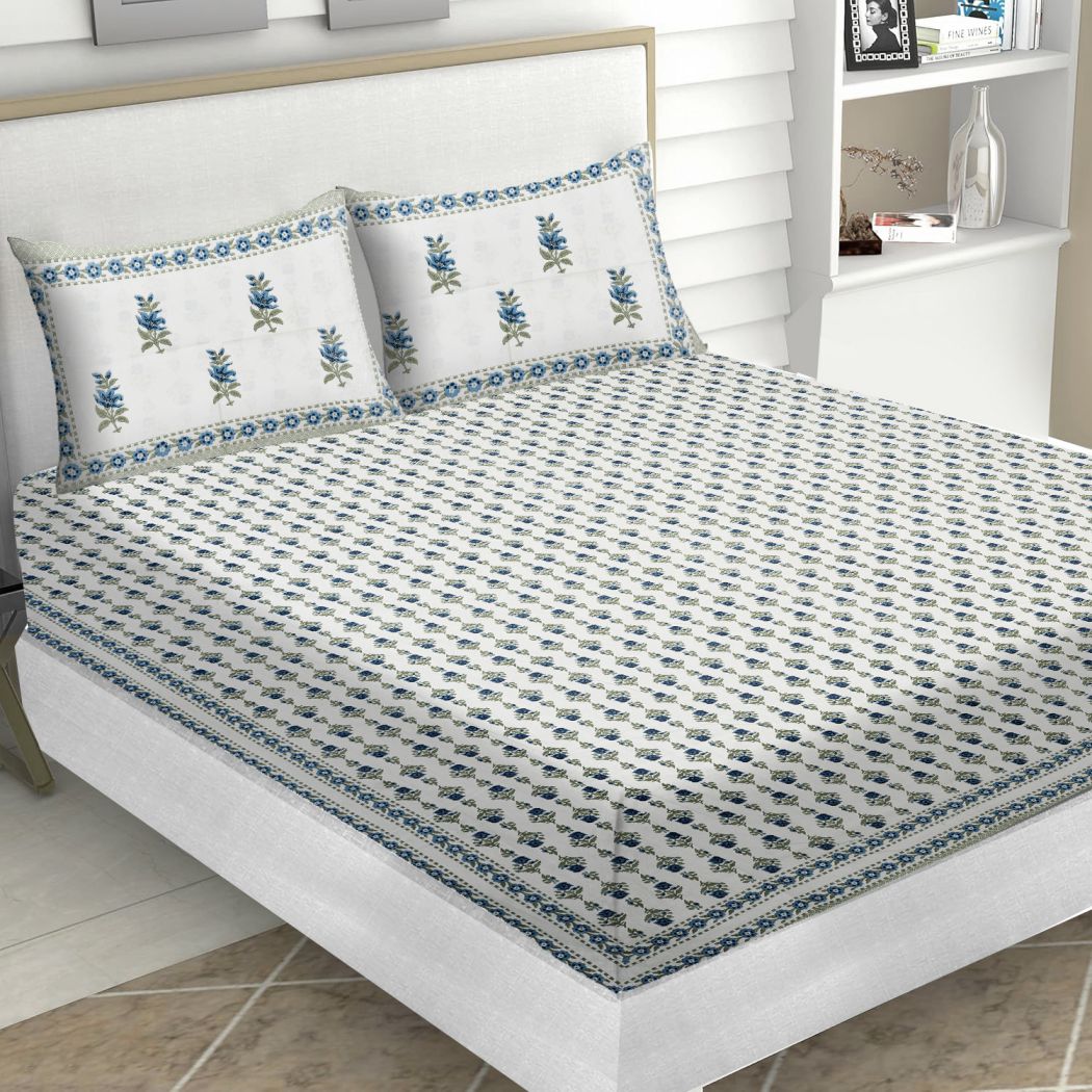 Blue flowers with pale green stems & leaves are spread across this bedsheet. It has a pale green border. Variation available in red colour & green colour