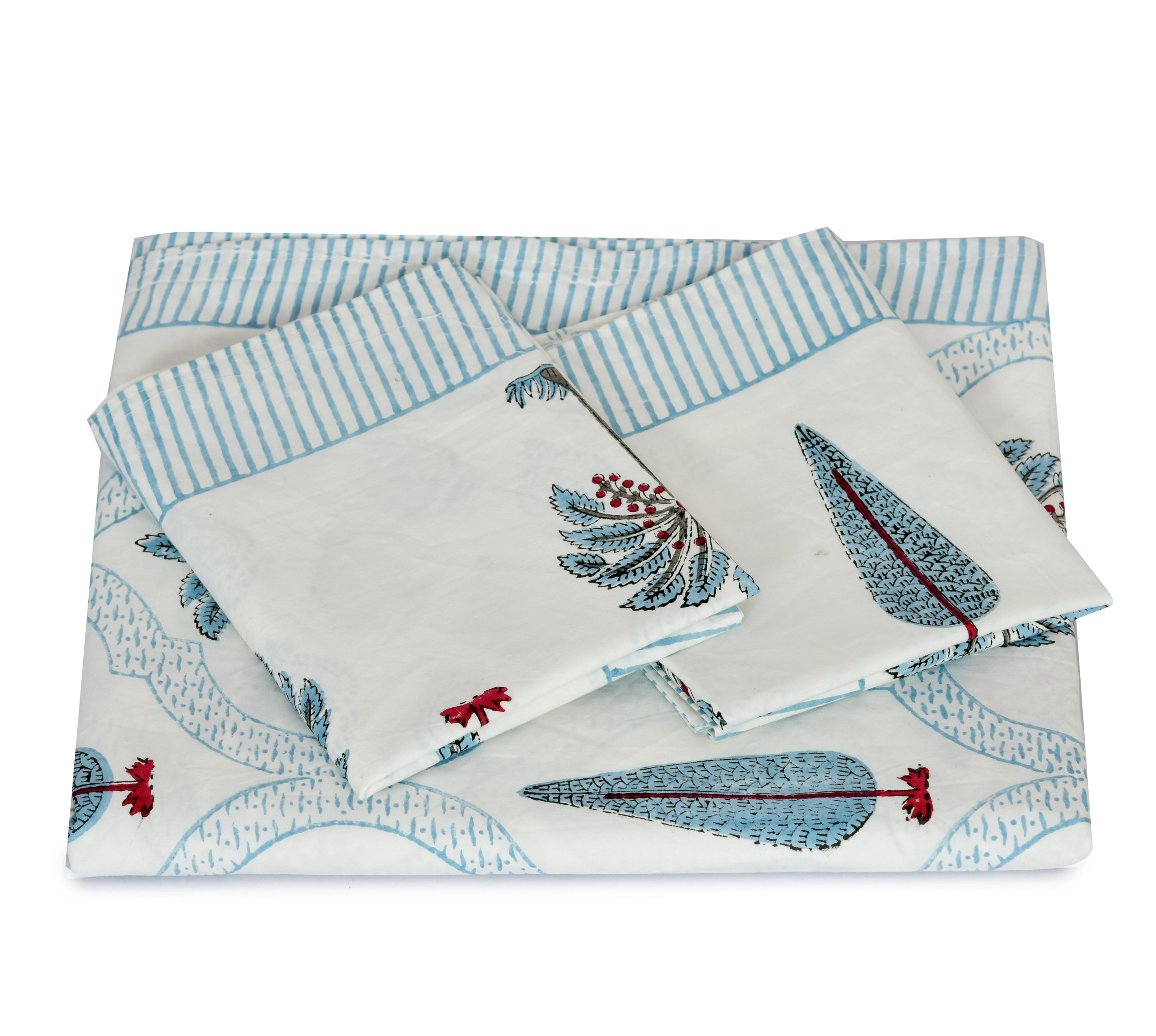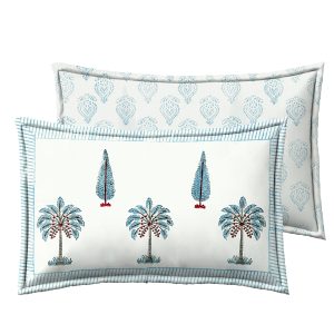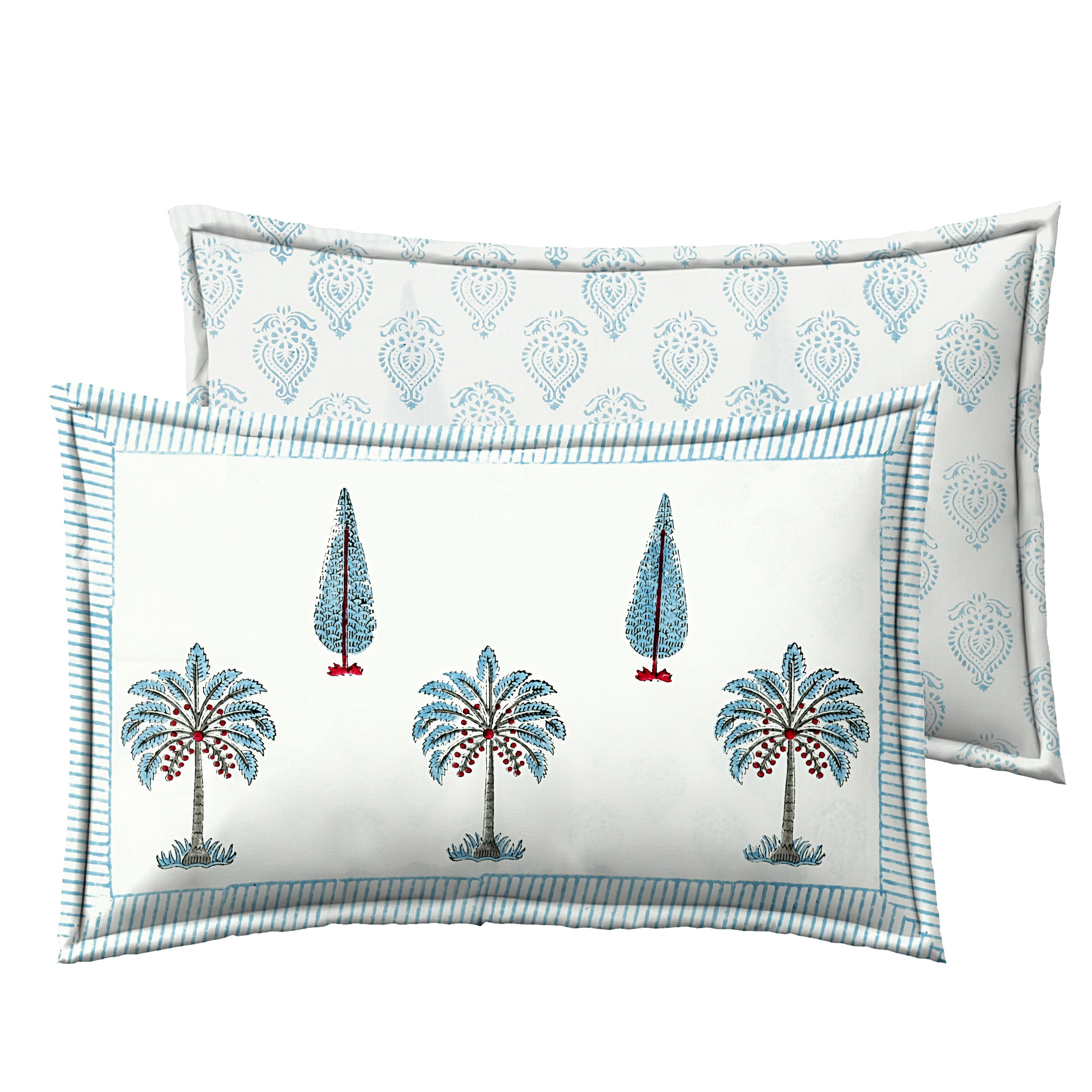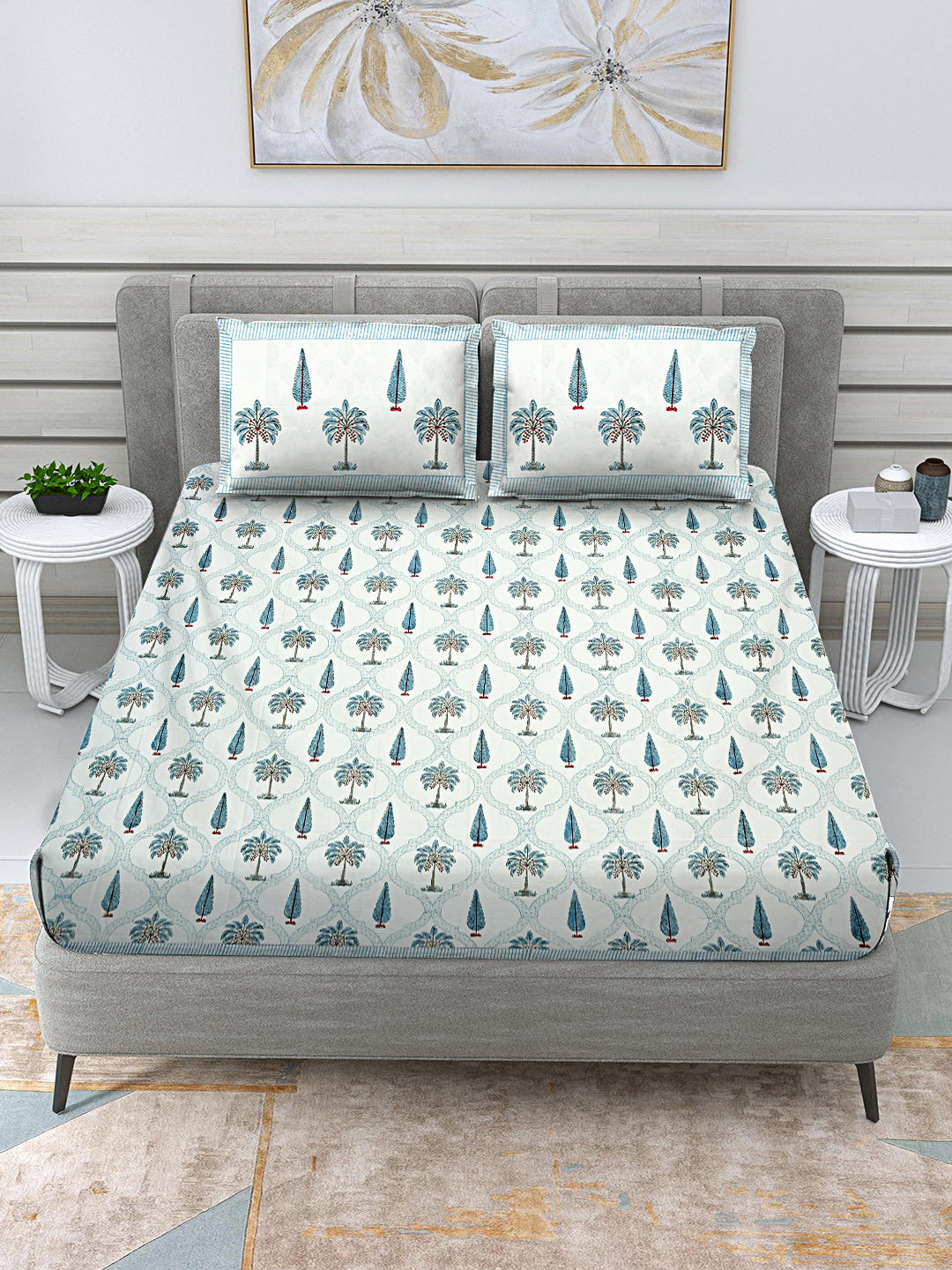 Transform your bedroom into a tranquil oasis with this exquisite block printed double bedsheet in an elegant light blue palm & cyprus tree pattern