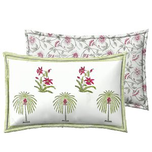 Transform your bedroom into a tropical paradise with this exquisite double bedsheet featuring a charming block print design of palm trees & red flowers that add a pop of color
