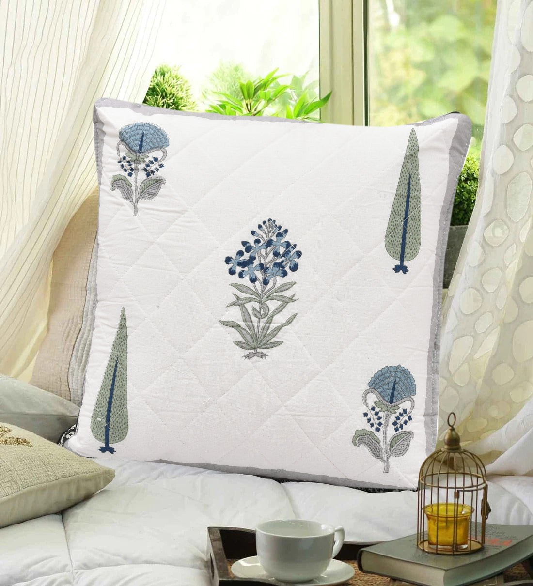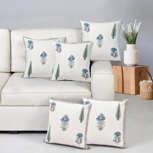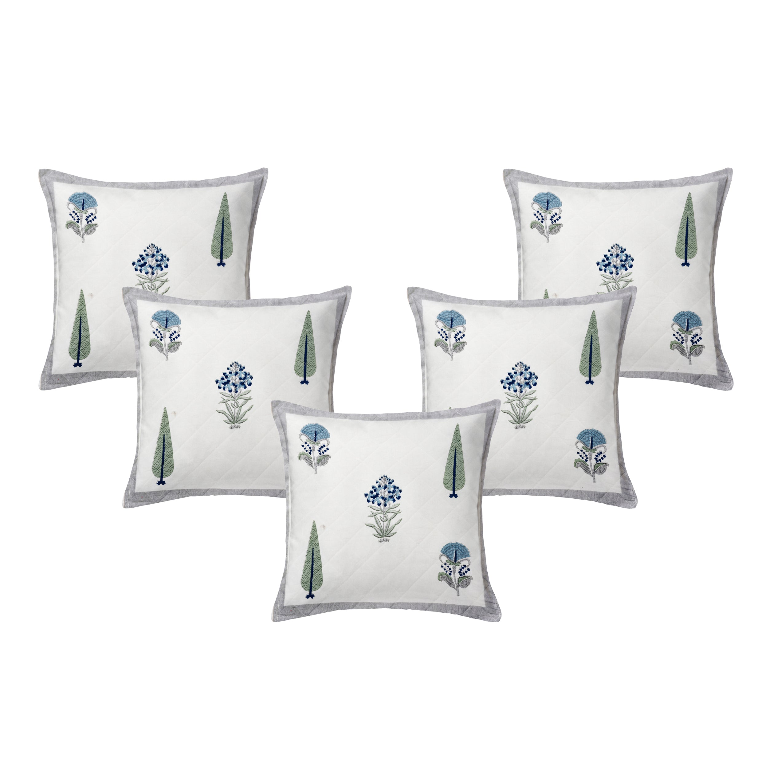Each cushion cover is block printed with blue flowers & grey leaves & trees. The border is grey. Variation in other colours also available