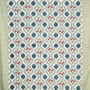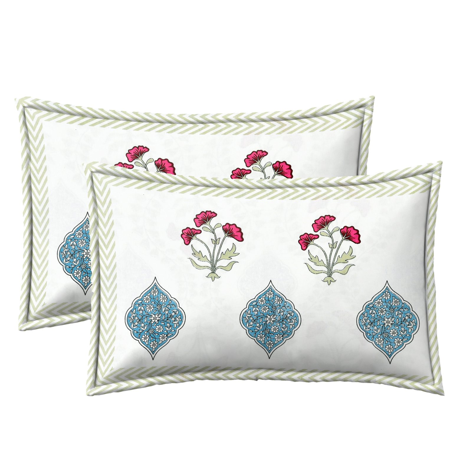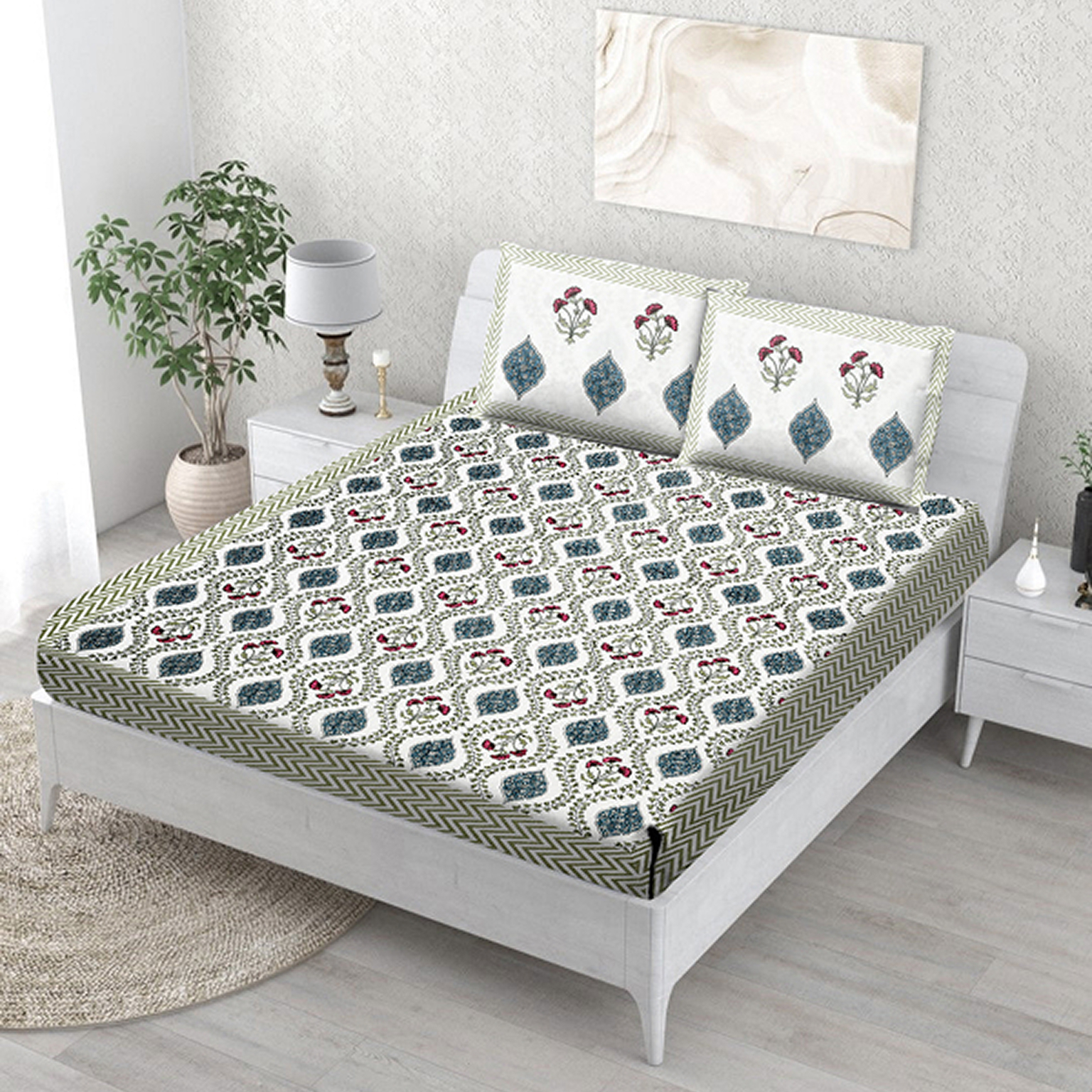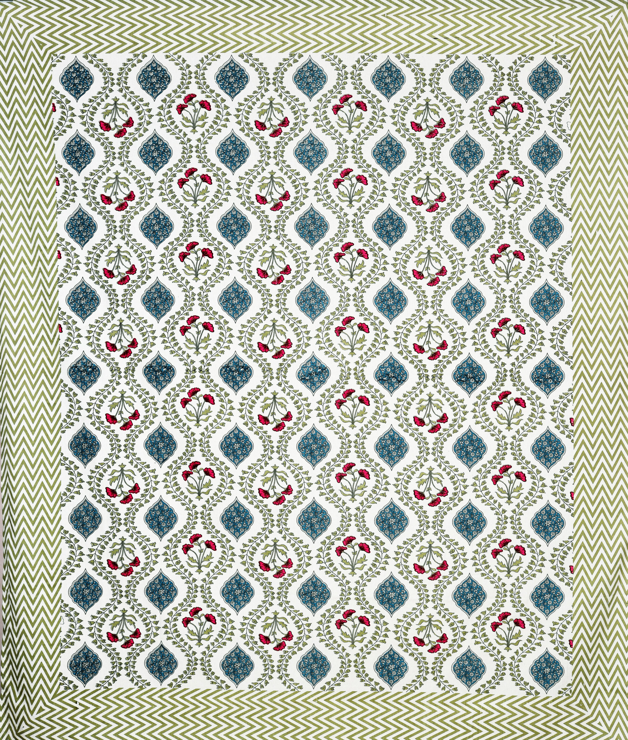 A jaal of green buds encompassing red flowers & blue mosaic with white flowers. This bedsheet has a green border. Variation available in light blue colour