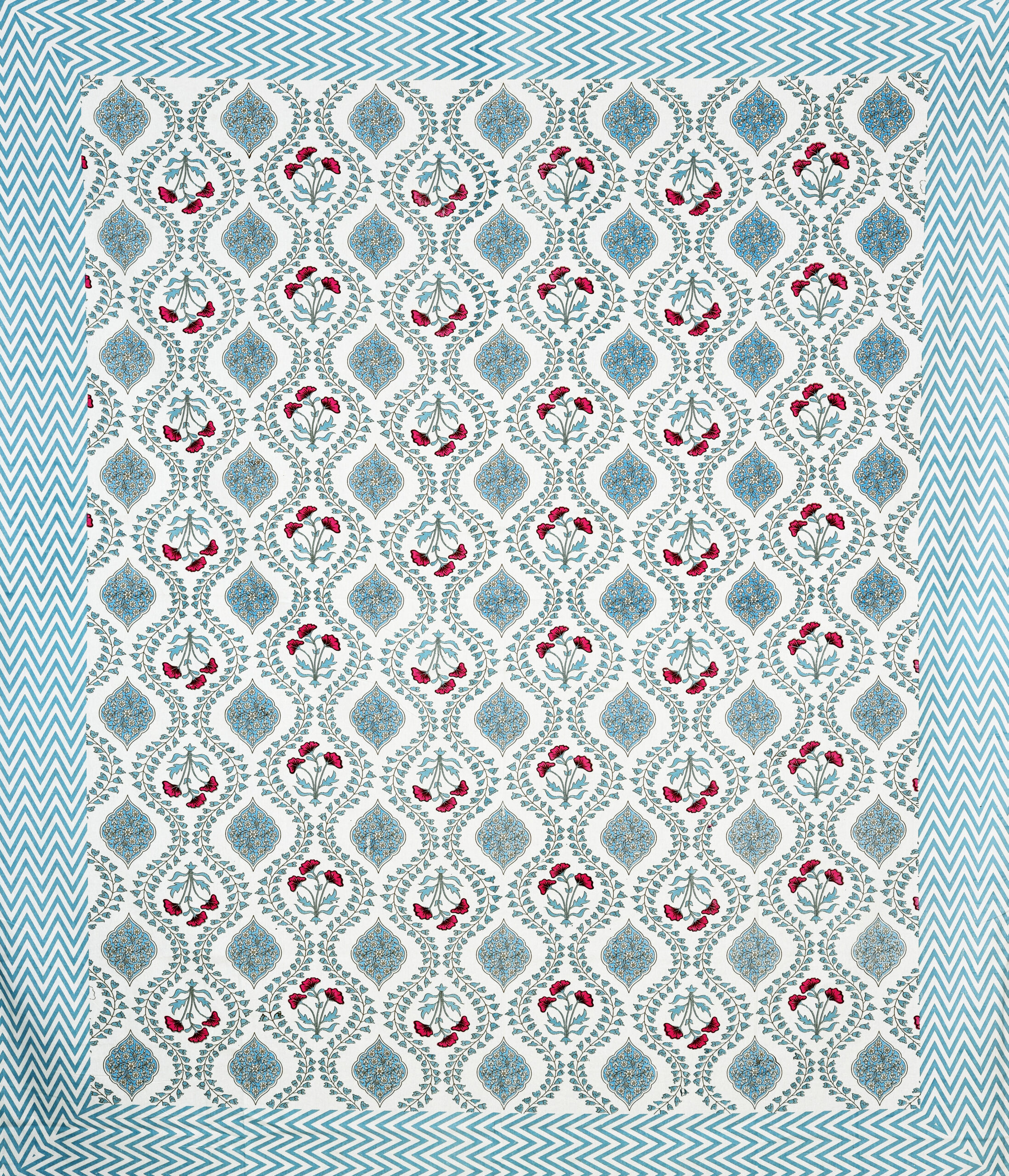 A jaal encompassing pink flowers & blue mosaic with white flowers. This bedsheet has a blue border. Variation available in green colour
