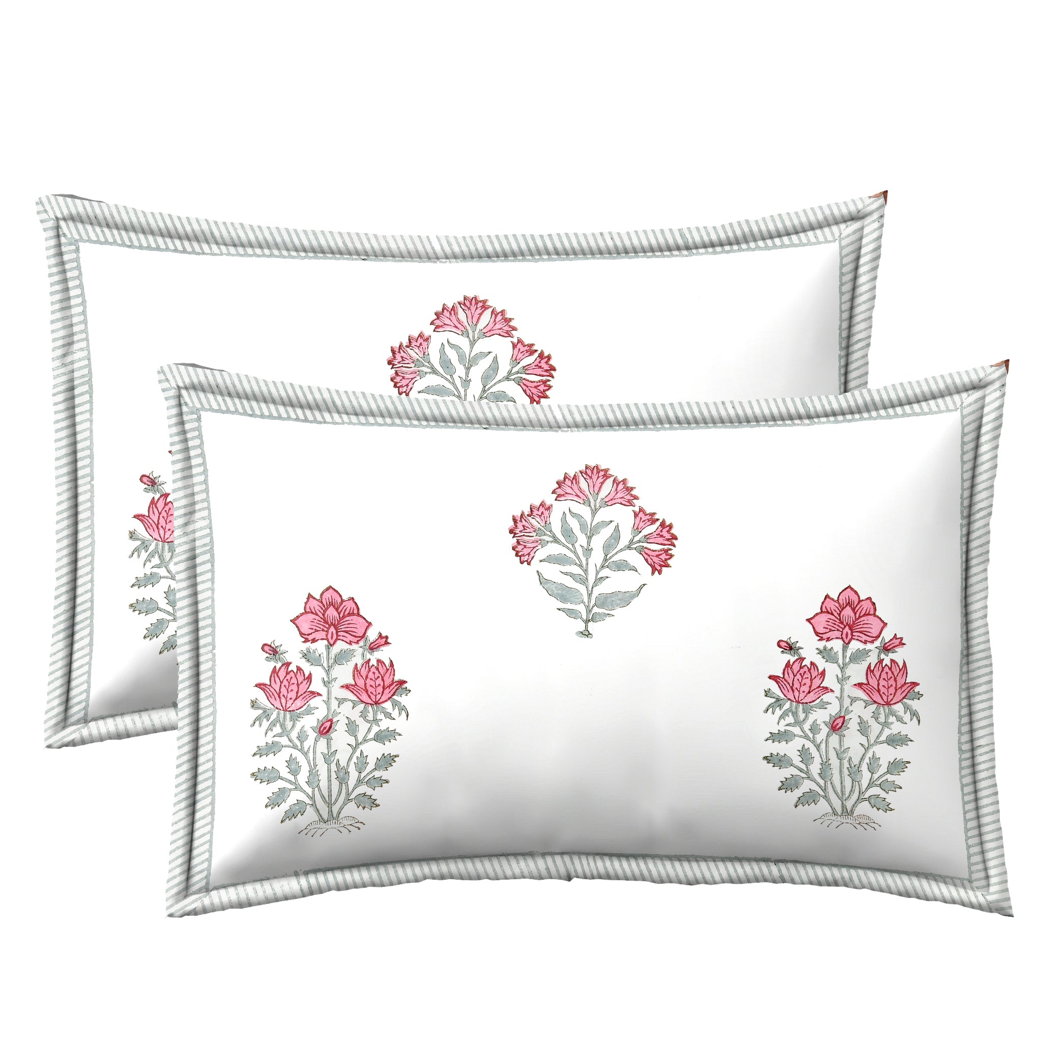Differently designed pink flowers are spread all over an off white background. Which  makes this a charming bedsheet in pink. Pillows have a border with green stripes
