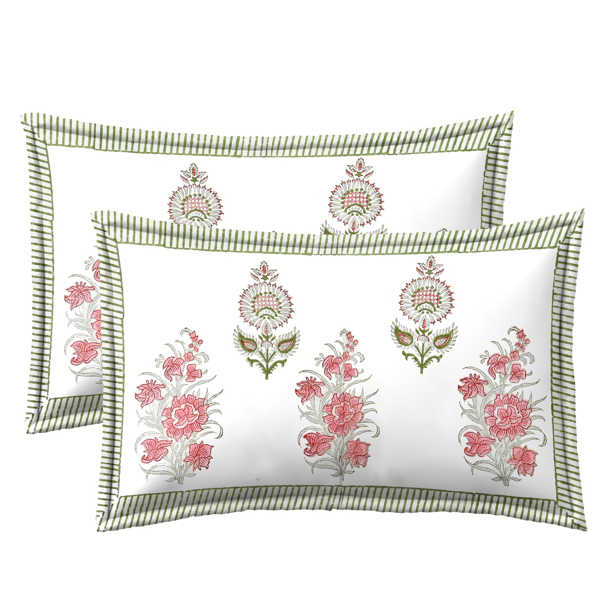 Pretty in pink! Beautiful pink & contrasting green floral design will render your bedroom into a pink paradise. The pillows have a striped green border